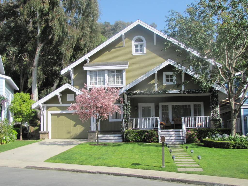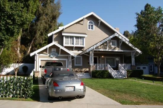 The house is a Craftsman style home with a brown/grey weatherboard exterior. It also features a Craftsman interior with wooden paneling and stone fireplaces, and Mission style lighting fixtures.