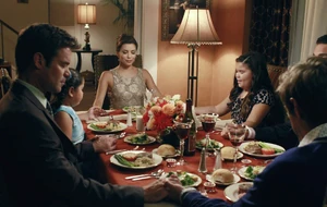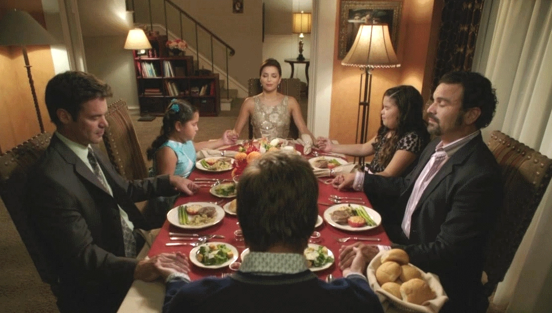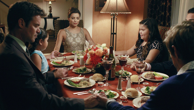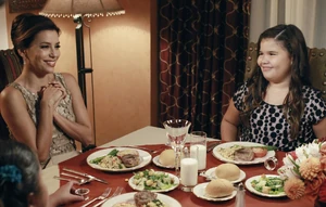 The Solises are having the Hunter-McDermott couple over for dinner. Juanita is saying prayer, as everyone closes their eyes and holds hands. During this prayer, Gabrielle slips Juanita a dollar bill, which she takes and promptly hides in her cleavage - so basically, Gabrielle is paying her daughter off in order to get her to behave appropriately for the evening, and Celia, still with her eyes closed, tries to stick the salt shaker in her mouth, which Gabrielle replaces with a piece of candy.