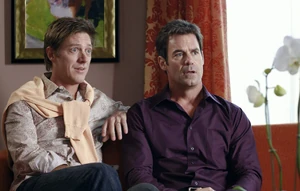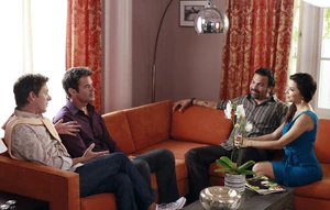 Over at Bob and Lee's house, Gabrielle and Carlos sit down to talk to them, having brought them flowers, and Bob is surprised that they want them as the possible guardians of their daughters. Gabrielle explains that in case something happens to them, they think the gay couple would be great parents for their girls. Bob is uncomfortable, and passes this off as an "honor". Lee points out that they love Juanita and... the other one, as he can't remember her name, but they have so many closer friends on the lane. He suggests Susan, and Gaby and Carlos stumble until they come up with a reason as to why Susan would never work as the kids' guardian: she's a racist. Bob and Lee are shocked by this statement, as Susan never appeared to be a racist to them. Gaby states that it's a new thing. Bob then suggests Bree, a suggestiong that Gaby tosses to the side by referring to her friend as "an alcoholic with a house full of guns". When Lee suggests Lynette, McCluskey or anyone at all, Carlos finally picks up on the fact that they probably have a problem with their girls. Bob explains to him, nervously, that they're still trying to figure out how to take care of one girl, and the Solis have got two of them already, and they're both... after a while, Lee adds the expression "monsters". He claims that they all know it, so there's no point in dancing around it. Carlos tries to hold back his anger, and Gabrielle takes the opportunity to tell Bob and Lee that the girls are much more well-behaved now, and Lee reminds her that he babysat them two months before and Juanita punched him in the neck, whereas the other one bit him. Carlos must remind him yet again that the other one's name is Celia. They then insist that they're so well behaved, with Carlos adding that they have to see it to believe it. Lee tells them that's a great idea: they can have them over for dinner the following day, and show them how well-behaved the girls truly are. Gaby and Carlos are caught by surprise by this proposition, and try to weasel out of it, but Bob insists that said dinner party takes place the exact following day. Then it's settled. As the Solises leave the Hunter-McDermott home, they realize they're in a jam.
