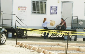 Over at Chapman Woods, Bree arrives at the construction site bearing a basket of food, and finds Ben sitting outside a trailer drinking beer. He's surprised to see her there, and she pretends to be there to celebrate the first day of construction with lunch. Ben tells her he's already eating (referring to his drinking, actually) and confides in her that there was a little problem. Bree acts as if she doesn't know anything, and he promptly tells her his guys found a body buried in the woods. She acts surprised and asks him if he's called the police. Ben tells her "Not yet", and Bree is somewhat relieved. She then asks him how they found the body, and he reveals that they were collecting soil samples and dug it up on Halloween night, then proceeding to store it. She asks him why it's taking him so long to call the police, and he replies that he keeps hoping there's a way out of this mess. Once he calls the police, his project becomes a crime scene, they shut it down, and he loses a lot of time and a lot of money. Bree tells him that's a shame, and adds that it must be so tempting for him to just make the body disappear. She tells him he must've thought about re-burying it, or dissolving it in acid, or wrapping it in heavy chains and dropping it in a lake. Ben is surpised by all her hypothetical suggestions on how to dispose of a cadaver, and she coyly tells him she's sure he's thought of that. He admits that he has, but if he hides it and it comes out later... he can't take that risk. Bree reminds him of all the people who would lose their jobs, and of the poor men who dug up the body, as they could face charges. He tells her he knows that, dismissively, and then apologizes by claiming that she's just telling him what he's been thinking about for a long time already. He then tells her there's no way out of this, and she appears to have lost hope, saying "There isn't, is there?", frustrated. He tells her he's gonna call the cops right then to get it over with. He gets up and enters the trailer, and Bree leaves. He sneaks back outside to grab his beer, and notices her running into the woods.