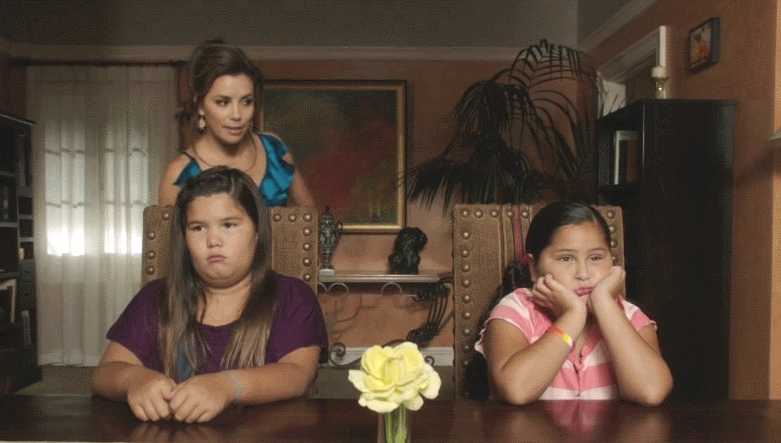 A few moments later, Gabrielle is seen setting up the dinner table for them, as a sort of exercise, and asks them which of the utensils laid out before them is the salad fork. Juanita asks her what "salad" is, and Celia holds up a spoon with pride, much to her mother's displeasure. Shortly afterwards, Gaby is seen trying to comb Celia's hair, which is a mess, and finds a lollipop tangled in it. Celia looks upset, as her sister tells her she did say it wasn't a good hiding place. Later, they are seen in the living room, rehearsing references to musicals. Juanita states that it's too hard, and wonders why gay people can't like cartoons instead. Gabrielle notices that Celia is sucking on the previously seen lollipop, and asks her if she just took it from the garbage. She takes it away from her daughter, and looks very frustrated with her offspring.