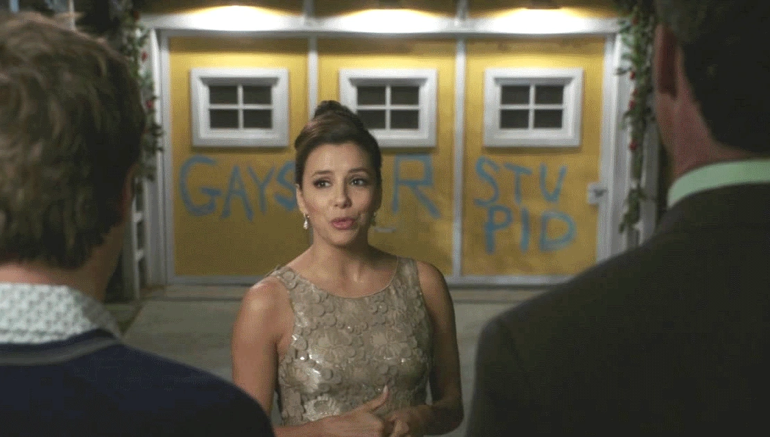 After the dinner party, the Solis couple and the Hunter-McDermott couple leave the former's house. Lee is going on about how great the night was and how delightful the girls were as well, particularly when they sang the Dreamgirls number. Gaby tells him she's just glad they could come, as they are so special to them. Carlos asks her if she left the garage door open. She positions herself in front of the garage, with her back turned to it, and tells the gay couple that they're practically family to them. Carlos proceeds to go and shut the door, and Gaby goes on about how that's why when they were thinking who they'd want to be guardians of their children, they're the first ones they considered. However, the pleasant moment is suddenly ended when the garage door shuts down and the phrase "GAYS R STUPID" can be seen written in it. Bob and Lee are shocked, as is Carlos. Gaby turns to the garage, and then back to them, saying "This aside, it was a pretty good evening, wasn't it?". Bob and Lee leave, without saying a word, and so does Carlos. Gaby is left there hopeless.
