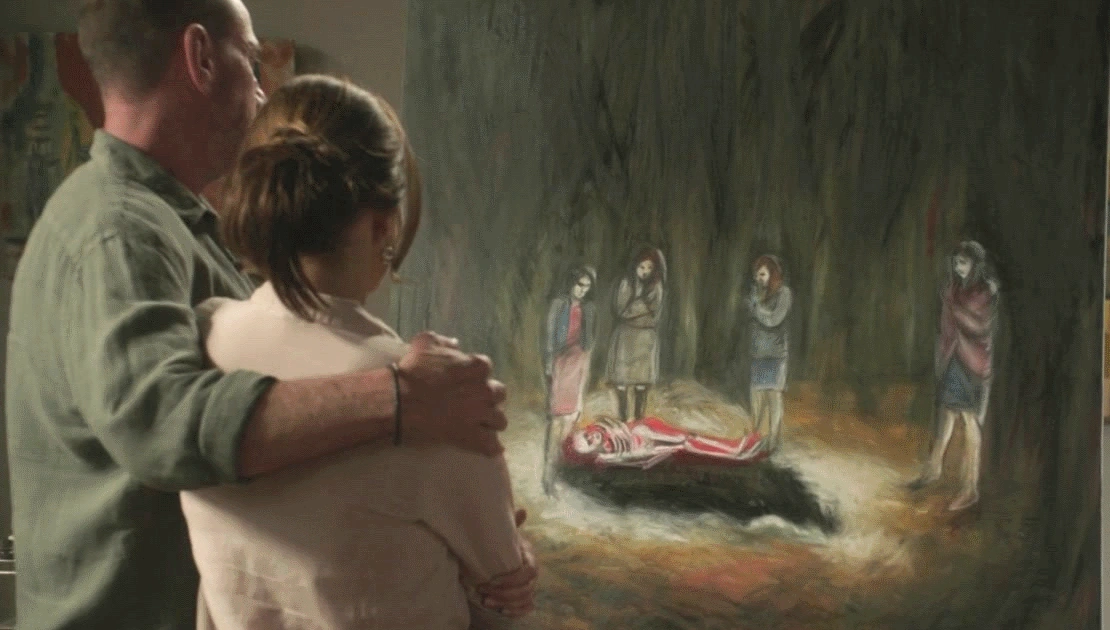 Andre tells Susan "Finally" and puts his hand on her shoulder. The painting is revealed: it's a dark and creepy depiction of the four women banded together in the woods around an empty grave, and a skeleton lying in cloth beside it.