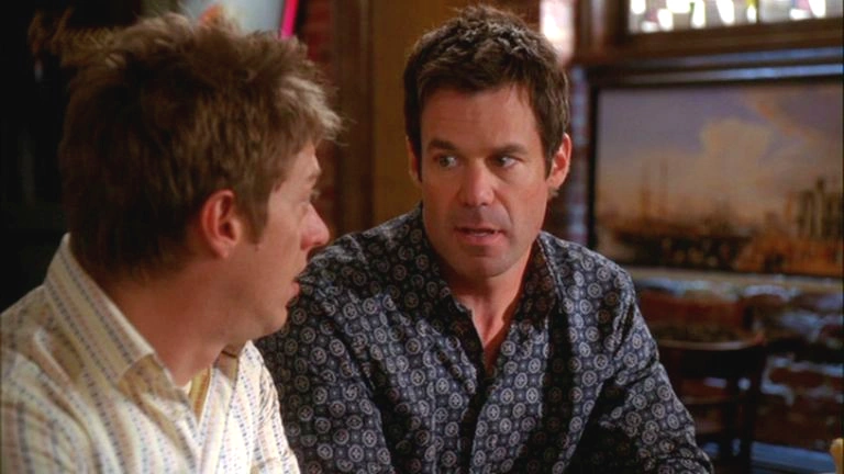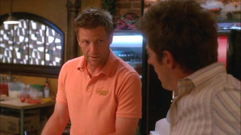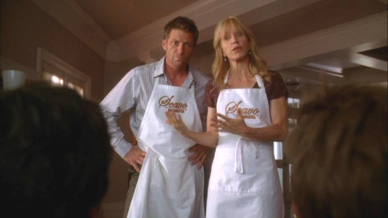 We see Tom carrying a box from the back room of Scavo's Pizzeria and taking it behind the counter as the shot focuses upon Lynette and Bree making plans across the table from Bob and Lee. Bree runs through food plans of the ceremony and finishes with mentioning she will collapse in an exhausted heap. Lee points out that she didn't mention the ice sculpture and Bree tells him that there is to be one cherub ice sculpture delivered at 1:30. Lee seems confused and tells them that he specifically told Katherine that they were going to go with the enchanted castle and Bob weighs in with, "And I told her that we were going with the cherub as we are not eight year-old girls." Lynette stares at Bree who too finds the situation awkward as Lee goes on to say that all of his life, he has dreamed of having a wedding where he would serve drinks from a vodka mote surrounding a castle rendered from ice which he does not think is too much to ask. Bree looks behind them and she sees Orson enter the pizzeria as Bob insults Lee by saying that he is acting like Faye Dunaway in the boardroom scene from "Mommie Dearest". Lee is maddened as Bree says that she should let them work it out and gets up to walk over to Orson. Lee sits there saying that they'll go with the "stupid baby angel" and says he needs some coffee. He walks in a strop over to the counter as the shot switches so we can see Bree talking to Orson. She asks him what he's doing there and she knows it isn't for pizza due to him being lactose intolerant. He replies by saying that he's there to offer his assistance after Katherine left her in the lurch. Bree believes this to be him trying to act the hero and save her while she is lonely and vulnerable and she tells him she's fine. He asks her not to be stubborn and offers his penmanship for writing place cards. She snaps, "Don't you dare throw your calligraphy skills in my face when you know I'm at a low point." She makes it clear she does not need his help and walks away. She passes Lee on her way who is sitting opposite the counter to Tom.