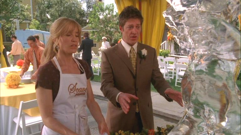Lee runs out of his house angrily with Bob calling after him. The latter says that it's just an ice sculpture, The two begin to publicly argue as Lee turns around and exclaims that it is not just an ice sculpture. Lynette and Tom stare at the argument as Lee goes on with saying that it is the ice sculpture, making him move to the suburbs, and forcing him to be nice to his homophobic boss. Lee points to Tom and says that he was right, if he doesn't start standing up for himself then he's doomed. Lynette turns to Tom and he says, "I don't believe I used the word 'doomed'." Lee says that Bob is always overruling him and treating him like a child but he's had it. Lee tells him the wedding's off and storms off himself, Bob yells at him and also storms off. Tom starts to explain the situation to Lynette but she cuts him off, not caring, she says that they have to fix it unless he wants to tell Bree that he torpedoed her ceremony. Tom turns to Bree who is yelling at an employee who screwed up and threatens to hurt him. Tom says that he'll get Bob and Lynette says that she'll get Lee; the two depart.
