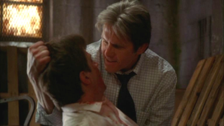 Detective Romslo puts the phone up to his ear, having just dialed, and greets Wayne who is on the other line. We see Wayne pacing up and down a unidentified building clutching his cell phone to his ear, he greets the detective who says he wants to give him a heads up that his ex came into the station and tried to file a report that he had kidnapped her new husband. He jokes the situation off, laughing and saying he could ask for a ransom. The detective notes that Wayne always said she was crazy and now he knows for sure, he wishes him well and hangs up. Wayne hangs up the phone and throws it away dismissively. Anger floods through him and he kicks an unconscious, swollen, blood-covered Adam who is lying on the floor. He says they've done kidding around and crouches over Adam, demanding that he tell him where his daughter is, Adam, eyes closed, does not respond. Wayne picks him up by the back of the head and stares at his face, Adam is unresponsive and Wayne tells him not to die on him. He sighs and drops Adam to the floor before standing up. He kicks Adam again and yells in anger, afterwards, he walks away. Wayne is now gone and we see a close-up of Adam's bloody face, slowly, his eyes open, revealing to us that he's alive.