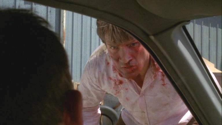 We see a bird's-eye view of the unidentified building from before where Wayne had held Adam captive. Adam quickly emerges from the door, still bloodied up and injured, and a car comes towards him. Adam walks over to it as it stops and the driver, shocked, asks if he is okay. "Do you need some help?" the driver asks, "Yes." Adam responds, he then opens the door of the car, pulls out the driver, gets into the car saying, "Thanks for stopping." and drives away, leaving the driver on the floor with no car.