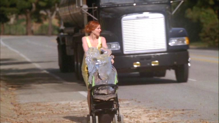 Bree is now walking along the sidewalk, pushing along Benjamin's stroller with the ice sculpture sitting in it. She looks determined and warned out as she forces it along and a large truck drives by. Bree starts flailing her arms around, wanting attention from the driver but it drives past her, covering her in dust as it goes. She begins pushing the stroller again.