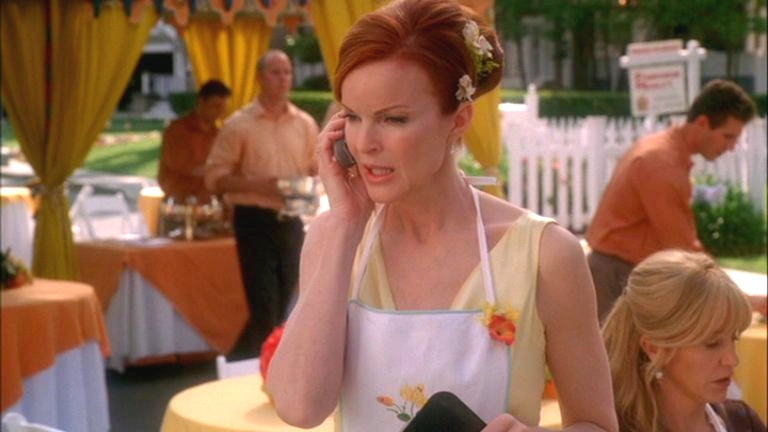 We see the preparations for the ceremony on the lane are all going swimmingly and we hear Bree is making plans with some employees. We see some poorly made napkin swans on a table and Bree walks over to them and begins talking to Lynette, who made them all. Bree says she would like to be more tactful but can't and bluntly fires Lynette from napkin duty as her swans are pathetic. Lynette pleads for her not to and insists that she will get the hang of it. Bree gets a phone call and turns around to answer it on her cell, she recognizes the caller and asks them the whereabouts of the ice sculpture. She says that 6 o'clock is too late and she'll have to pick it up herself. She turns back to Lynette who presents a poorly made napkin swans in her hand, wanting a positive response, Bree says in a patronizing tone, "Why don't you fill water glasses? That's an important job too." Lynette is slightly saddened and Bree walks away.
