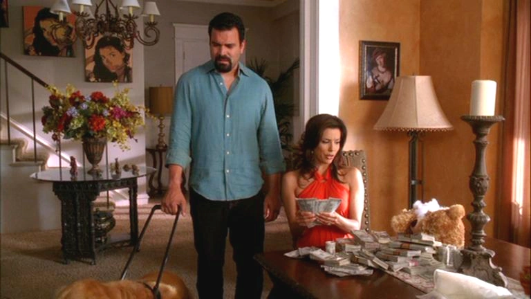 Carlos and Roxy are seen walking down the stairs together, he calls for Gaby who says, "Over here Carlos!". He walks over to her and says he has a theory about all of the bad things that have been happening to them, such as his blindness and the low money - karma. He believes that the universe is trying to tell them to be better people after being so greedy and selfish. Gaby is counting money on the table and responds with, "I just found $118 ,000 in Ellie's teddy bear." after having counted the total, Carlos looks up saying, "Hey universe! Bite me!"