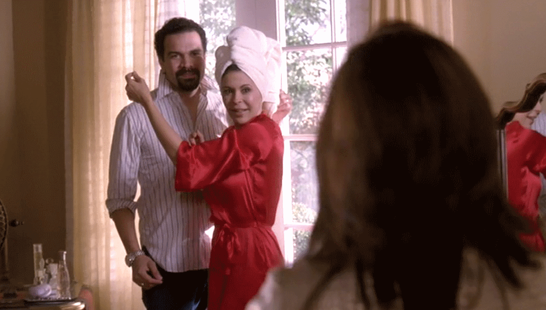 Gabrielle is bathing with John as the two continue to dwell in their steamy affair. They get out and Gaby sees Carlos pulling up in the driveway earlier than expected. She panics and rushes John out of the house, bunching up his clothes and throwing them at him as he falls out of the window. Carlos enters the house and looks around suspiciously before he asks where John is, and he pops up at the window tending to the bushes, Carlos can only see him from the waist up and is oblivious that John isn't wearing any pants. Later, Gabrielle goes to John’s house and tells him that the two of them have to be more discrete about their affair. He presents her with a gift: a rose, to which he describes as perfect, just like her. Gaby realizes that he is actually falling in love with her. Later, Carlos gives her a new, fancy, very expensive car and they drive away in it in glee as John watches with a sad look on his face. ("Ah, But Underneath")