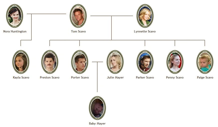 Lynette married Tom Scavo, son of Allison and Rodney Scavo, brother of Peter and Theresea Scavo. Tom has a daughter named Kayla from a one night stand named Nora Huntington. Nora is the daughter of Joe and Sheila Huntington. Lynette is the mother of Porter Scavo, Preston Scavo, Parker Scavo, Penny Scavo, Paige Scavo, and the miscarriage, Patrick Scavo. In the eighth season, Porter becomes the father of Julie Mayer's baby girl, Sophie Scavo. Lynette eventually has five other grandkids.