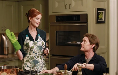 Bree shows Orson and Andrew her new cookbook and Orson wonders why Bree named the book "Mrs. Van de Kamp" instead of "Mrs. Hodge". Bree reminds Orson she started th company when she and Orson were separated. Orson tells Bree she could just change her name when she made the cookbook. Bree says she can't do that because she is known as "Mrs. Van de Kamp". Orson listens to Bree talk show interview. When they ask if there is a Mr. Van de Kamp, Bree only mentions that Rex is deceased not even bringing up getting remarried. Orson is furious with Bree when she gets home at midnight, Orson demands Bree make him his favorite dinner. ("We're So Happy You're So Happy")