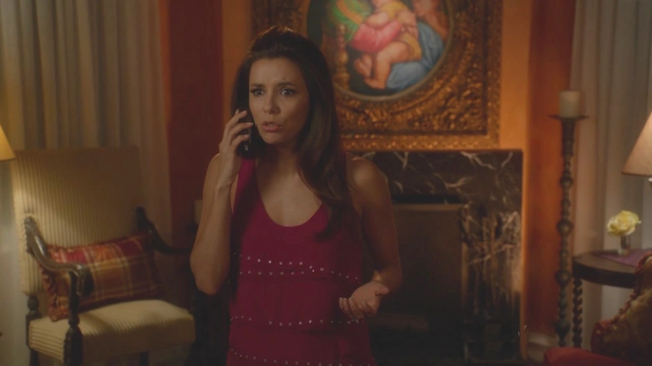 Over at Tom’s apartment, Lynette is stood outside the main doors, trying to ring Tom’s room with the radio outside. There’s no answer, so Lynette rings another resident’s room; a woman answers. Lynette puts on a Mexican accent and says she forgot her key to Tom’s apartment and asks to be let in. The woman says Tom isn’t there, so Lynette explains that she’s a maid. Suddenly, Chloe, Jane’s daughter, arrives, listening to Lynette and tells her she’s pathetic for impersonating a maid stereotype. Lynette tells Chloe that she knows Tom and Jane are leaving for Paris, but asks to speak to Tom for five minutes. However, Chloe says they left for the airport one hour ago. Lynette asks Chloe if she knows the flight name because she tried ringing Tom and he wasn’t answering, making Chloe call her a stalker. Lynette says she isn’t a stalker, so Chloe tells her she knows about the “hiding under the bed incident”. Lynette then says that something happened and Tom needed to be there for the children’s sake. Chloe gives in and takes Lynette to her room to give her the flight information.