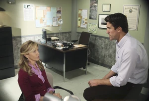 Moments later, in Chuck’s office, Susan is sat nervously at his desk. He kindly, yet dauntingly offers her some coffee. She politely declines and says that she’s trying to cut down on caffeine. Chuck asks her if it makes her "jittery and nervous", she says it does, and then he asks if she’s "jittery and nervous" right now. Susan quickly says "no", to not let him catch onto her nervousness, and then she drinks some of the coffee to make him less suspicious. However, as she drinks it, he notices her hands slightly shaking. Chuck then shows Susan a photo of her painting and asks her why she painted it. She says it’s hard to explain why artists paint what they do, and Chuck, playing along with her excuse, says they sometimes might not know why they paint something, to which Susan shakily agrees. He then shows Susan a photo of Alejandro and says she may have painted the picture because of her guilt over what she did. Susan looks at the photo and edgily says she doesn’t know who he is, so he says it’s the man in her painting. But Susan says it came from her imagination. Chuck calls “bull” and says it’s Ramón Sanchez (Alejandro). Susan stays adamant that she doesn’t know anything, so Chuck says her painting isn’t art, but a guilty conscience that won’t be relieved until she tells the truth.