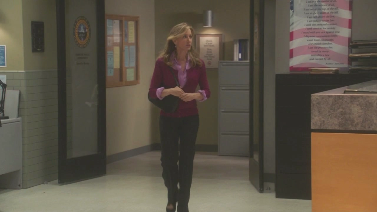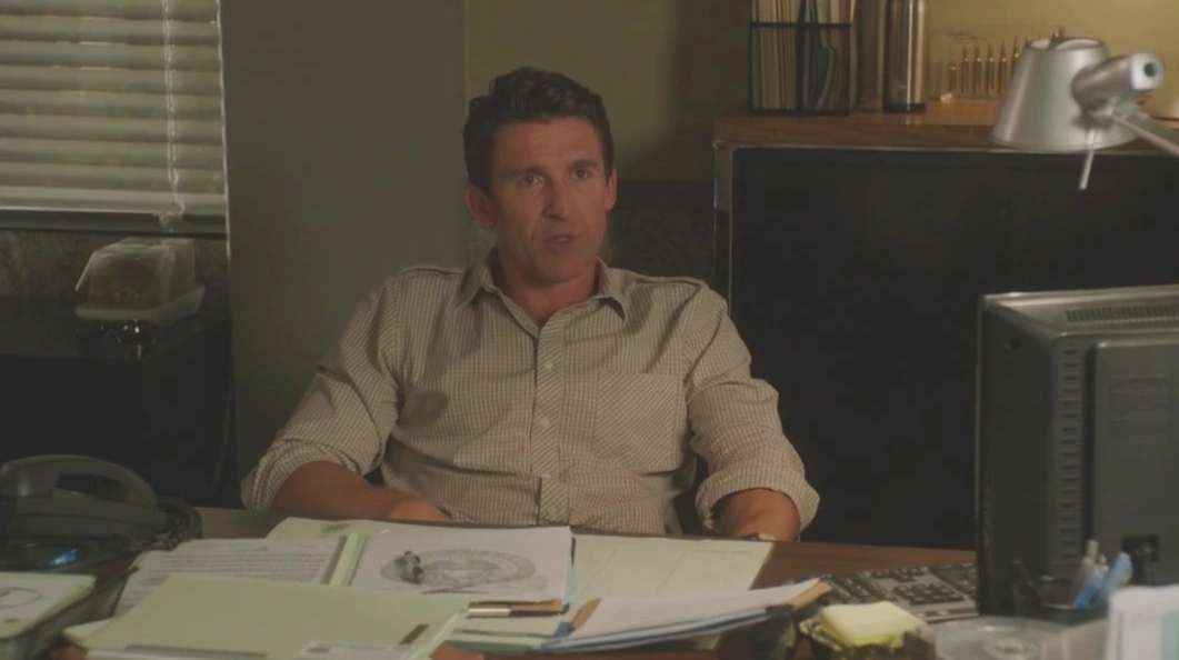 Later on, it’s Lynette’s turn for the grilling, and she’s also sat on a chair at Chuck’s desk. He slides the photo of Alejandro towards Lynette and asks if she’s ever seen him. She confidently tells him no, so Chuck tells her she’d make a good cop because she can contain her true emotions. Chuck then approaches Lynette and tells her she’s “one of the good people”, but he can tell she’s covering something up. He tells her to forget him as a cop, and to see him as a friend for a moment. He explains that a jury will forgive people if they understood why something happened, but firstly she has to stop lying. Lynette insists she’s not lying, frustrating Chuck. He sits down on his desk and asks how much more of a toll she’ll let the secret take on her, as the secret she’s keeping is clearly the reason Tom walked out on her. Infuriated, Lynette strongly slaps Chuck across the face. She unremorsefully apologizes, saying he told her to forget he was a cop. She then stands up and begins to leave the office. As she reaches the door, Chuck, smiling, points out that she let her emotions slip. Lynette doesn’t answer.