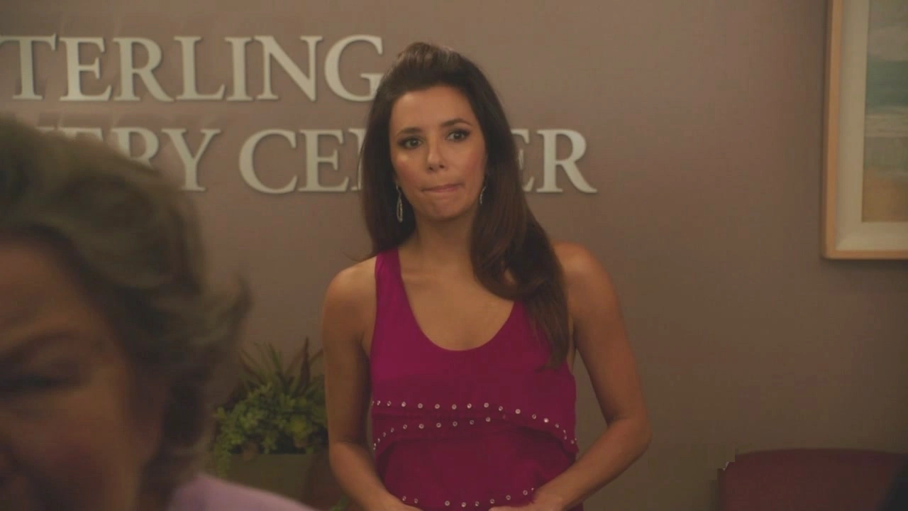 At Sterling Recovery Center, the rehab center Carlos is staying at, Gabrielle hurries in to the main lobby and approaches a man at his desk. She interrupts him while he’s reading his book - The Help - and she says she needs to speak to her husband, Carlos. The receptionist asks if it’s an emergency, but she says she just needs to tell him something. The nurse then tells Gabrielle that Carlos is under restricted access so she cannot see him. Gaby emphasizes that she really needs to talk to Carlos, but the man apologizes and says he can’t break the rules. Gaby then flirtatiously leans over the desk, flaunting her chest in his face and say’s rules are made to be broken, but the man hints to her that he is gay. As Gaby walks away, frustrated, a distraught family enters. A mother and father drag their son into the clinic, and they’re followed by the boy’s grandmother and sister. As the family walk through the clinic, Gaby mingles in with them and sticks with the grandma and comforts her... slightly. She then pushes the grandma aside and begins her search for Carlos, but she’s found by a nurse. She asks where Gaby is supposed to be, so she quickly says she’s with the Manzani family. The nurse explains if Gaby is with the family then she needs to stay for the group counseling. Gaby tries to wiggle her way out, but the nurse ensures that she stays and she leads her to the room.