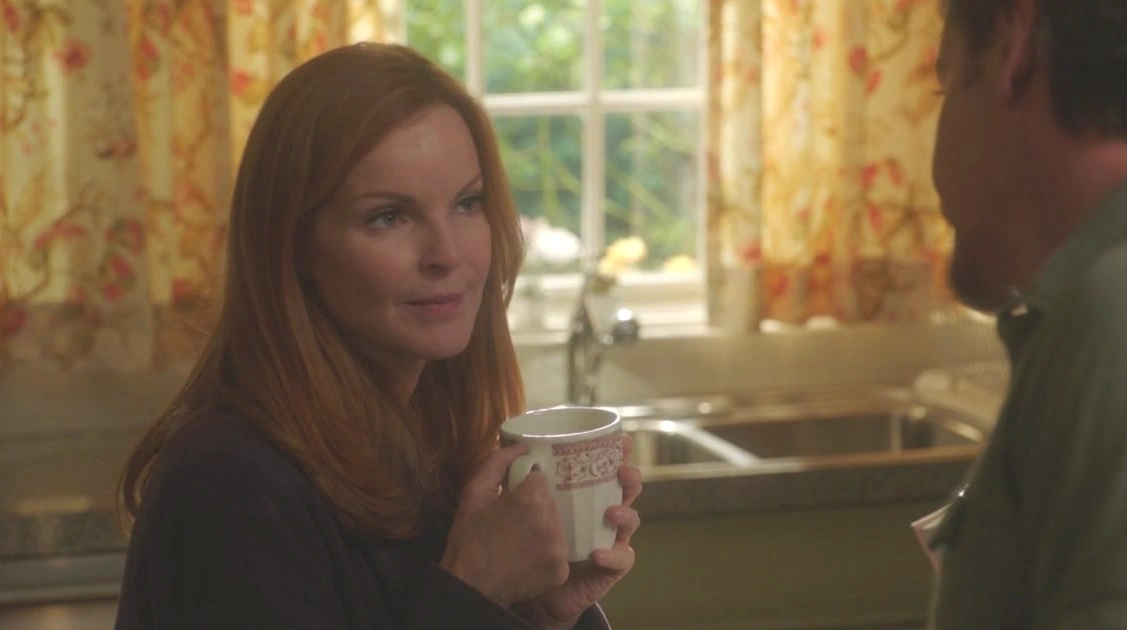 Outside Lynette’s house, Bree knocks on the door numerous times, forcing Lynette to rush out and ask her to stop as Paige is sleeping. Bree apologizes and explains that nobody is talking to her. She then tells Lynette she wants to make it up to everyone for lying. Lynette asks if Bree thought she could bake her way out of the situation, but Bree explains it’s a piece offering to start a conversation. However, Lynette says they have nothing to talk about after she lied to her. Bree begs Lynette to understand and she says she was trying to protect her. But Lynette states she wasn’t, and that she was trying to control everything, as she always does, but Bree doesn’t agree. Lynette continues, saying that the four girls were supposed to trust each other and stick together. Bree says everything will be fine as long as the girls have their friendship, but Lynette says there isn’t a friendship anymore. As she heads back inside, she tells Bree she’s on her own, as is everyone else. When Lynette’s gone, Bree depressingly walks home, tips the scones into a bin and then takes a bottle of wine and wine glass from a cabinet in her kitchen, making it apparent that her drinking problem has returned.