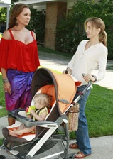 Lynette is walking Paige in her little stroller and she encounters Renee, who is sporting a sexy blouse that shows off her nice cleavage. Lynette says "Hey, Renee... ladies." - cleary referring to her friend's breasts, and Renee stops and tells Lynette not to distract her bosoms, as they've got important work to do: she's on her way to see the new neighbor (Ben), and give him a ride on the old welcome wagon. Lynette understands that she means she'll hit on Ben, and tells her that was fast, as she didn't know they were even talking to each other. Renee tells her they aren't, and thus Lynette asks her what makes her so sure he'll be interested. She sighs, looks at her boobs and says "Hear that, ladies?", then looks back at her friend and says "Watch and learn. I will show you some of my secrets.".