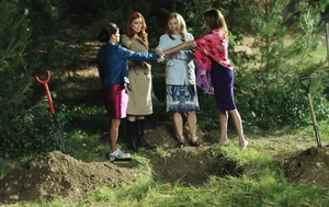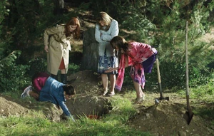 Bree puts her hand out and looks at Gaby who does the same. The pair then look at Lynette, who moves forward and places her hand on top of Bree and Gaby's. Susan is reluctant but finally agrees. Bree and Gaby then start to shovel dirt on top of the body, filling in the ditch, as Susan and Lynette look away in horror.