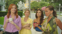 The girls are all sitting at a round table. Lynette is wrapped in a towel, and Susan is drying her head with another towel. Lynette tells them she went food-shopping the day before, and she kept having to put things back. She'd take a couple of cans of peaches, and then she'd remember that only Tom liked them, so she put them back. "Sweet pickles... Tom. Put them back.", she adds, emotionally. Bree reaches out to her and shares her sympathies, saying that with everything that's been going on, she hasn't been there for her. Gabrielle adds that she thinks they've all been guilty of that. She then takes Susan's hand and apologizes to her. Susan says "It's just so damn hard." Gabrielle sympathizes with her and what she just said. Lynette tells her the good thing about Mike and Tom not knowing is they can't be implicated. If something were to happen, at least they'd be okay. Susan thinks quietly for a while, and then says, looking very depressed, "We are never gonna be able to tell anybody about this, are we?"; Bree answers negatively, and asks if she's gonna be able to live with that. Susan looks at Gabrielle, and says she's gonna try. Gaby, still squeezing her friend's hand, smiles at her, and Bree then puts her hand over theirs, followed by Lynette.