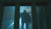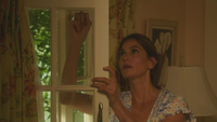 In the dark, we see some steps and a banister from a flight of stairs. Feet come walking up said stairs, and then a shot of the back of the man who's walking up the stairs is seen. The man walks up to a door, when he reaches for the knob, blood is seen in the door's frame. The door opens, and it is revealed that the man is a dirt-covered and angry-looking Alejandro. Lynette immediately wakes up from this horrid dream. She's sitting in her bed, pressing her sheet against her chest, and looking terrified. She gasps a few times, looks at the door to the bedroom in front of her, and whipes her mouth with her hand. She is then seen looking through the bedroom's window. Across the street, the lights are on in Bree's office.