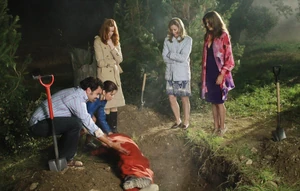 Carlos, Gabrielle and Lynette load the body into the back of the latter's car, as Susan and Bree keep lookout. In the woods, the group carries the body to where it'll be buried. Bree and Carlos then begin to dig a hole. Once the hole is dug, the body is tossed into the ditch.