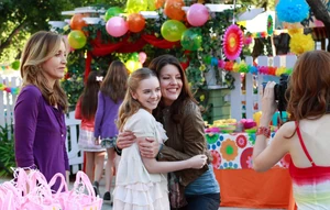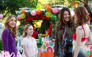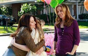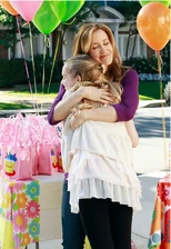Meanwhile, during Penny's birthday party, she is ecstatic with how great things are going. She finds her mother setting up the gift bags at the front of the house, and thanks her. They hug, and Lynette tells her she just wanted her birthday to be perfect. Then, Jane shows up, and says, "Happy birthday, Penny", and the two hug. Lynette not-so-subtly says that nothing's perfect. She then less than excitedly greets Jane, and tells her that Tom went to pick out the cake, so maybe she'd like to wait in the car or something. Then, a young woman, Cindy, shows up behind Jane, with a camera. Lynette says she didn't realize Jane was bringing a guest, and Jane explains that this is her gift for Penny (Lynette jokes: "A geisha?"), and Jane introduces the girl as her niece, who's a photographer. Cindy greets Lynette in a sing-song fashion. Jane explains that Cindy is gonna take some pictures of the party, and then she's gonna make a little memory book. Penny is excited, and Jane then pulls her closer so they can take the first pic. Lynette isn't happy. The two then put on funny faces and Cindy takes another pic, then exclaiming "Perfect." They laugh.