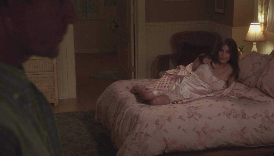 In his bedroom, Mike is looking out the window via binoculars, when Susan comes in, wearing a sexy nightgown, and teasing him. She thanks him for fixing her car that day: "I like a man who's good with his hands, it's very sexy." He is distracted for a few seconds, but then turns his attention back to the window. She doesn't seem to notice this, as she makes her way to the bed, playfully trying to seduce him. "Although, I think my engine is still running a little hot. 'Vroom...'". They both chuckle, and Mike asks her what she's doing. "The question is 'who am I doing'; the answer is 'you'". She gestures at him to come to bed, but Mike tells her he's really beat. He closes the window, and she approaches him, and starts caressing him, until she notices a bulge in his pocket area. Thinking it's 'something else', she jokes, saying, "Is that a gun in your pocket or are you just happy to see me?". She strokes it, until she shockingly realizes it is indeed a gun. He takes it out as she questions him about the gun. He tells her not to freak out, and then tells her to sit down, as he's got something to tell her.