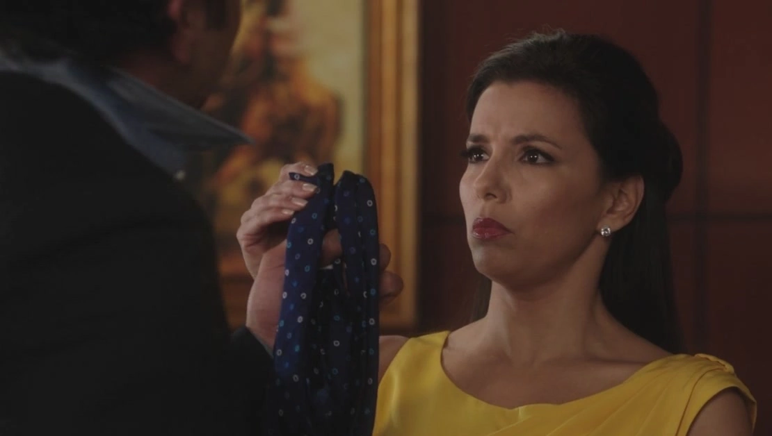 Carlos in his kitchen, none-too-excitedly admiring his brand new tie. Gabrielle comes in and asks if he'd like some fresh coffee to go, and when he says "Ok", she can tell by his tone that something is wrong. She asks him about it, and he tells that he's been thinking about he's worn a tie everyday for 25 years and he's always hated the way it feels around his neck. Gabrielle points out that she wears lots of uncomfortable things as well, and Carlos states that he's started to feel as though a tie is nothing short of a glorified noose. Gaby asks him if he's nervous about his first day back, and Carlos says he doesn't know, but he thought he'd be more excited than he is. Gaby reminds him that he's the boss, and if he wants excitement he should shake things up. She then says she's gotta get the girls to school, and leaves. Carlos continues checking out the tie, trying to feign interest.