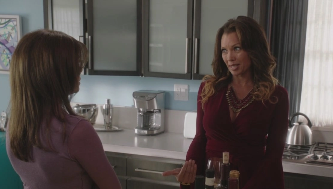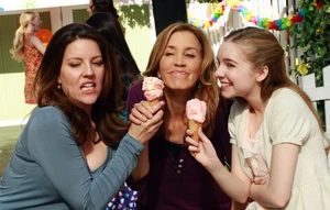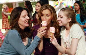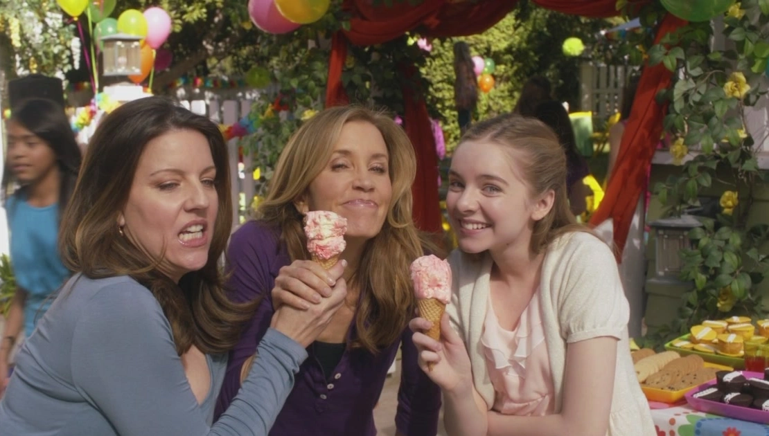 Later, during the party, everytime that Cindy tries to take a picture of Penny and Jane together, Lynette makes it her goal to photo-bomb the photograph, by always popping up in the background: when they're getting their nails done, when they're dancing, when they're jumping up and down on the trampoline, and when they're eating ice cream. When Lynette photo-bombs this final pic, licking away at a disgusted Jane's ice cream cone, Jane pulls her away for a sidebar, and Penny appears to pick up on the tension.