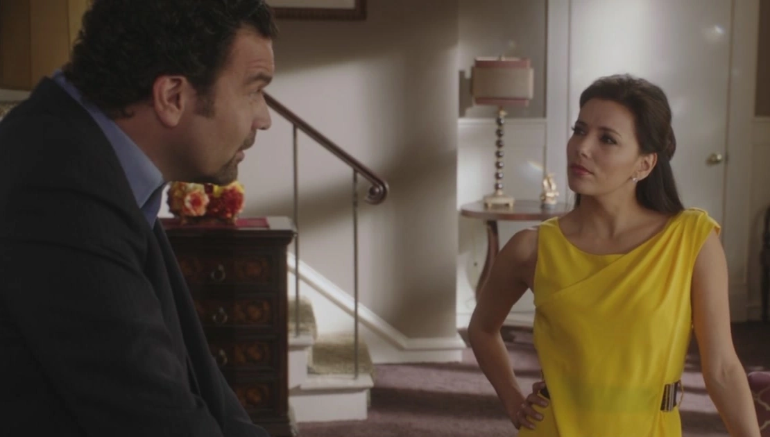 Gabrielle and Juanita come down the stairs of their house, and the mother asks her child if she has looked for the stray cat under her bed, to which Juanita replies positively, adding that Rufus is lost. Carlos comes home from work, and Gaby tells her she can't be of any help right now, so she should go look in the backyard. When Carlos gets in, Gaby ironically asks if it's just him or if he adopted a bunch of orphans on his way home. He walks past her, without saying a word, and into the living room, where he puts his briefcase down on the table. Gabrielle begs him to talk to her, asking what was going on with him that day. Carlos vents and asks if she remembers Bill, the guy from rehab he was always talking about. Gaby pretends to remember, but Carlos can see right through her. Carlos adds that he was his counselor, and now Gaby can remember, and she doesn't look too interested. She sits down, and Carlos retells a story once told to him by Bill, about his father, who was a pilot in Vietnam. He'd be flying his plane, 3'000 feet up, dropping his bombs, and going back to base. And it wasn't till someone sent him a Life magazine that he saw the result of his missions. The discovery ruined him. Gaby intervenes, incredulous that the man didn't know, considering he'd been dropping said bombs. Carlos tells her it was all about the 'distance'. And he relates to the situation, because all these years he's been 'dropping bombs' from his skyscraper, and he can't keep doing it. "I can't keep destroying lives for some... bottom line." He sits down, and Gaby doesn't quite know what to say.