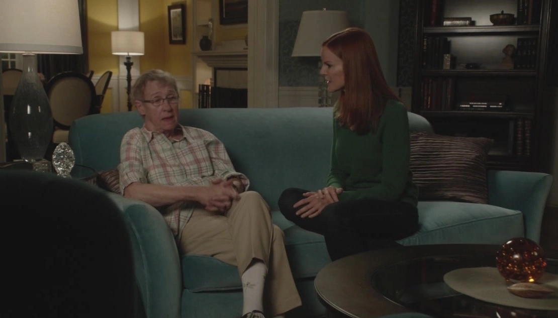 Not long afterwards, Karen is sitting in the couch, and Bree sits beside her, saying that she can't seriously be considering this. Karen tells her that cancer is a bully, and when it's as bad as hers it laughs at one's attempts to fight it. She then explains that the only way to win this fight is by deciding herself when and how she 'goes'. "So... will you help me?". A reluctant Bree asks what Roy thinks, and she tells her Roy was the first one she went to, but he couldn't do it. "Too much of a marshmallow.", she adds, before saying, "I need someone cold and heartless." Bree is surprised by this remark, and asks, "And that's me?". Karen jokes that a dying woman is sitting in front of her and she hasn't even offered her a cup of coffee yet, which proves her point. All an emotional Bree can do is smile at her neighbor while she says she doesn't think she can do that. Karen sighs, and tells Bree she doesn't want to die alone. She adds that the chemo is 'kicking her ass', and she doesn't want to waste away in some hospital bed. "Please help me go the way I want to.", she begs of her neighbor. Bree says "Alright. I'll help you." This said, she puts her hand over Mrs. McCluskey's.
