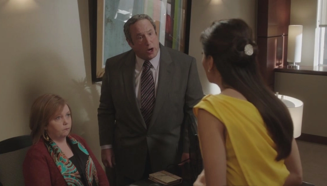 The following day, Mike and Susan are waiting inside an office at the local police station. Detective Harrison comes in, apologizes for keeping them waiting and asks what he can do for them. Susan promptly tells him that her husband did something really stupid and now they need police protection. Mike begs her to let him handle this, and Susan intervenes yet again, explaining that what he means by that is staring out the window with a gun in his pants. The detective sits down and asks them to start from the beginning. Mike starts explaining that a friend of his - whose identity he's not giving away - borrowed some money from a loan shark, and things got out of hand, so Mike helped him out. Susan explains that what he means by this is that he beat up a mob guy, which has potentially put his whole family in danger. The detective asks Mike if his friend knows that it's illegal to use the services of a loan shark, to which Mike replies that he does. Harrison then quickly asks Mike if he knows it's illegal to assault someone. Mike immediately tells him that the men broke into his neighbor's house, and he threw a punch at Mike, so he just defended himself. Susan then gets to the point: the loan shark wants to kill her husband, so he has to get arrested. Harrison points out that if Mike had called them after he broke into his neighbor's house, maybe they could have arrested him. Mike doesn't quite know how to respond, and Susan sarcastically points out that she'd already told that to her husband. Harrison then changes the subject to Mike's gun, asking him if he has a permit. An uneased Mike states that he thinks they're wasting the detective's time, so he'll take care of it himself. As he prepares to get up, Susan stops him, because his approach to the situation is what got them there. She turns back to the detective and reveals that they have a 9-year-old son. Harrison gets up and explains that, since they have their address, they'll make sure a patrol car keeps an eye on things, and he tells Mike that, should he see the loan shark, he is to call them. Mike nods affirmatively, and Susan asks if that's it. The detective tells her that's all they can do until something else happens. Susan, rather sarcastically, says "Great. Well, maybe we'll get lucky and something else will happen." The detective leaves the office, and the Delfinos are none too happy.