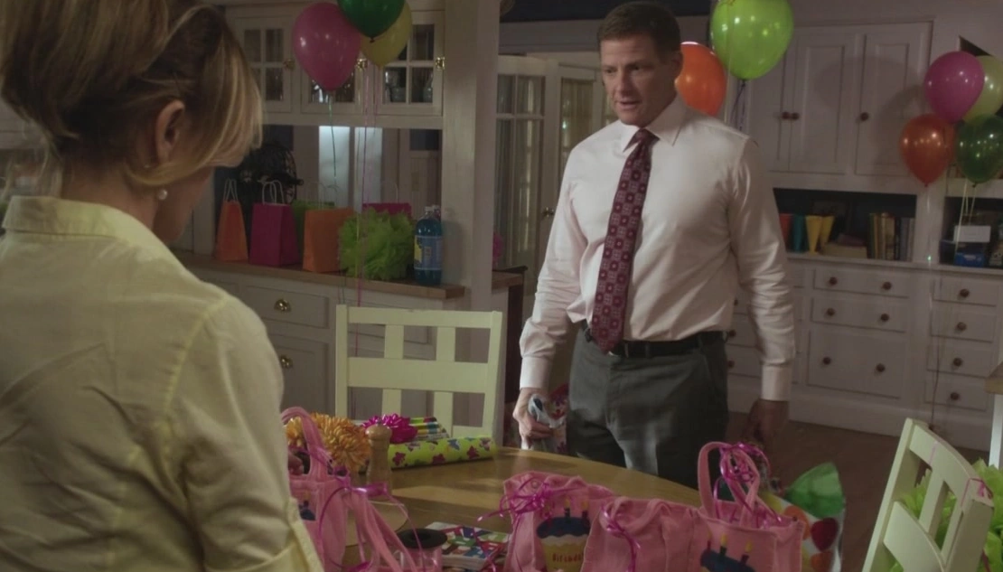 Inside Lynette's house, she is in the kitchen decorating the gift bags for Penny's upcoming birthday party. The kitchen is entirely decorated with several balloons. The doorbell rings, and she tells the person to come in. It's Tom, who brings with him a gift for Penny and a bottle of champagne. The rest of the house is filled with things for the party, including a large banner reading "Happy Birthday" spread over the couch. Tom tells her the place looks great, and compliments her for "going all out". Lynette tells him that after Porter's baby announcement, she has a new policy for all her kids: "If you can resist procreating, I will throw you a bitchin' party." Tom chuckles, and puts down the gift bag and the bottle. Lynette notices the champagne, and Tom tells her it's for her, since he feels like she should celebrate too, considering she went through 23 hours of labour with Penny. "That is so thoughtful", she says, before adding, "Uncharacteristically thoughtful. And now that I think about it, you could've brought Penny's birthday present to the party. So, um... what's goin' on?". Tom is reluctant to say it straight to her, but he ultimately reveals that he wants to bring Jane to Penny's party. Lynette is immediately unhappy about this. Tom says he realizes it's a little awkward, something Lynette agrees with, particularly since they're still married and it's a family event. Tom tells her Jane is a part of his life now, and he really wants to start including her in some of these things. Lynette asks why, and before he can explain, Penny shows up, excited to see him, and she then notices the gift bag. She asks if she can open it, smiling, and Tom tells her he knows this trick: if he lets her open it, she's gonna guilt him into buying another gift in time for the party. Penny jokes that that's totally what she's going to do, and then grabs the gift bag and runs off. "And I am totally gonna fall for it", says Tom, before he goes after her. Lynette calls him back, so they can finish their conversation, and Tom tells her they'll do it another time, suggesting in the meantime that she enjoy her champagne. Lynette appears to be curious.