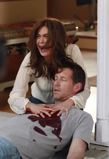 A while later, Roy can't believe what Bree has just told him. Part of that disbelief/surprise comes from the fact that Karen went to Bree of all people, since she doesn't even like her ("Yes, we've established that.", says Bree). Roy figured that when he said 'no' that would be the end of it, and Bree starts telling him that Karen seems more determined than ever, but is interrupted by Karen herself, who has woken up from her nap to find, with utter shock, that her 'suicide pie' has been cut into. Bree is surprised. Karen explains that she made that pie to kill herself, it's filled with sleeping pills, tranquilizers, and a bottle of 'liquid something'. Bree is horrified, because she's had two pieces. Karen, rather stoically, tells her she's sorry. She then asks if Bree would like to go to the hospital, to which Bree replies affirmatively. The three of them get out of the house, and Roy asks his wife what she was doing, making that pie. Karen says that if the two of them would 'grow a pair' and help her commit suicide, she wouldn't have had to make the pie. Roy refuses to take the blame for not having wanted to murder his wife, and Bree begs of them to continue their conversation later on, as she really needs to get to the hospital.
