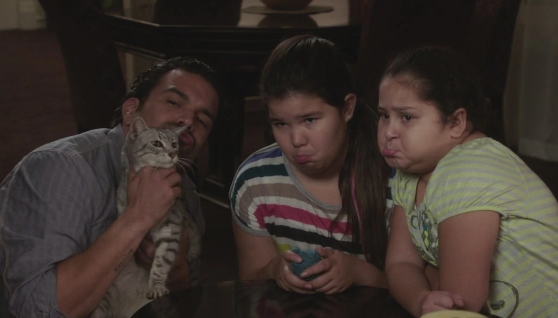 That night, over at the Solis place, the entire family is in the living room, with Gabrielle sitting on the couch, legs covered by a blanket, reading a magazine, and Carlos, Celia and Juanita playing with Rufus the kitty. Gabrielle isn't happy about the cat, claiming that she's allergic to it, and Carlos reminds her that she's allergic to everything she doesn't like, including the vacuum cleaner. She tells him that's medically verified. Carlos tells his girls to show mommy how sad they'd be if she made them give back Rufus. Carlos grabs the kitten and the three of them all put on pouty faces. Gaby claims to be unable to say 'no' to such sad and obviously rehearsed faces. Juanita asks her father if he wants to see him do a trick, and she then throws a ball of yard into the lobby and tells the kitten to fetch. It rushes out of the living room but then doesn't return, even when Juanita calls out for them. She jokes that he kind of does whatever he wants, and then she and her sister get up to get him. Carlos jokes that the cat will then fit in well around there. Gabrielle tells him she's not the one who brought 'kitty litter' into their lives. Carlos tells her the cat makes them happy, and it makes him happy. He then adds that if there is one thing he realized in rehab, is that there is nothing more important to him than taking care of them. Gaby says "I love you for that" and they kiss. She then puts down her magazine and hands him a gift: a tie. Gaby tells him it's for his first day back to work after rehab. Carlos doesn't seem too excited. He tells her he's been having so much fun with her and the girls he'd forgotten he had to go back to work the following day. He then thanks her (after she reminds him that she spent a lot of his money on the gift), and she then gets up to get the girls into bed, as Carlos appears less than enthusiastic about his return to work.