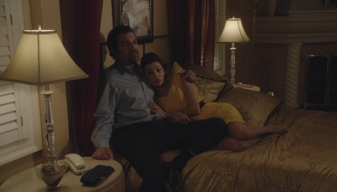 Later that day, Gabrielle comes into her bedroom and announces to her husband that Juanita is finally asleep. Carlos, sat on the bed, asks if their daughter's okay. Gabrielle positions herself next to him, on the bed, under his arm, and says, "Yeah, thanks to you." Carlos says, "God, that was so scary." Gabrielle says this puts thing into perspective, and Carlos agrees. Gabrielle adds that it reminds them that there's nothing more important than taking care of family. Carlos says he could not agree more. Gabrielle takes this to mean that he will give up on all his 'crazy talk' and go back to work, but an annoyed Carlos pushes her away, denying this, much to her shock. He tells her it's the exact opposite of what she thought. This means Carlos is more aware than ever of what really matters: giving back. Gaby says, "Why do you keep calling it that? You're not giving, you're taking, from us, your family!" Carlos says he doesn't know why he thought she'd understand this, considering she's always been selfish. Gabrielle confirms this, and adds that he knew it when they got married, and that was the deal: he'd make the money and she'd spend it. She says she's still holding up her end. Carlos says he is miserable at work, that he can't do it anymore, and Gaby tells him of the times she thought to herself that she couldn't do it anymore, when he was drowning his guilt in 'booze' and when he disappeared into rehab. But she willed herself to hold the family together because someone had to, and now it's his turn. She takes the tie and throws it at him. She then leaves the room, and they're both clearly angry. Carlos tosses the tie into a nearby laundry basket, furiously so.