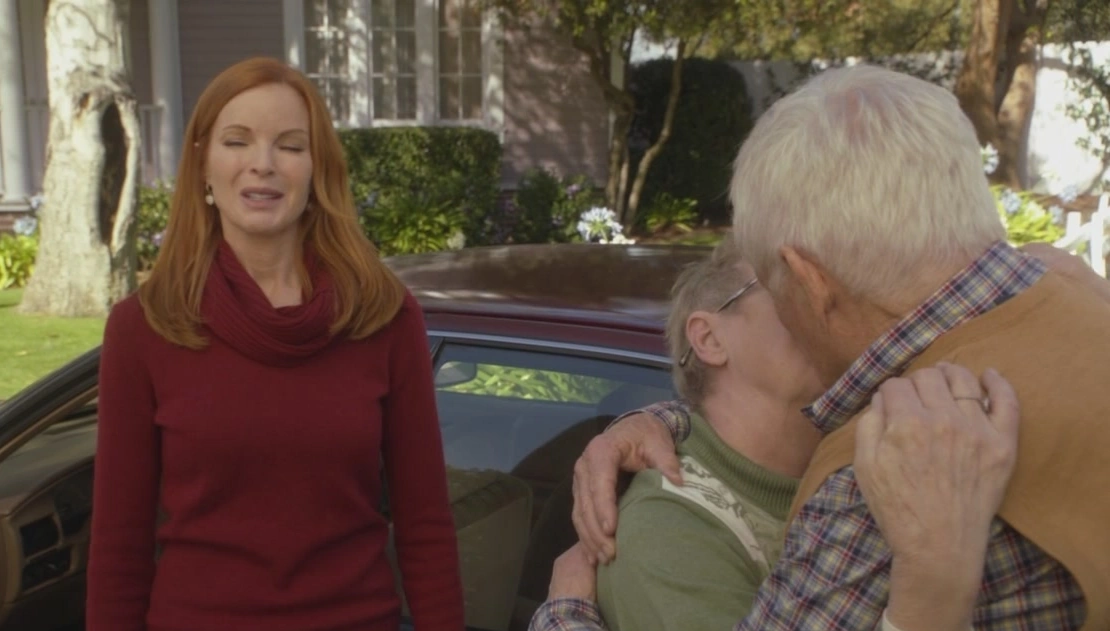 Karen tells her it's not the same, because she wasn't dying, but she is. Bree sympathizes with this, but explains to her that should she end her life, it'll ruin the memory of everything she did before that, it's all anyone will remember. Bree then asks her if she really wants to do that to Roy, and he jumps in, saying he doesn't want her to go before her time. Karen acquiesces, saying she'll stick around for as long as she can. She then proceeds to hug Roy. Bree is moved, but tells them they really should get going... and then the elderly couple engages in a long kiss. Bree is just annoyed. She gets into their car and drives off on her own.
