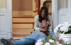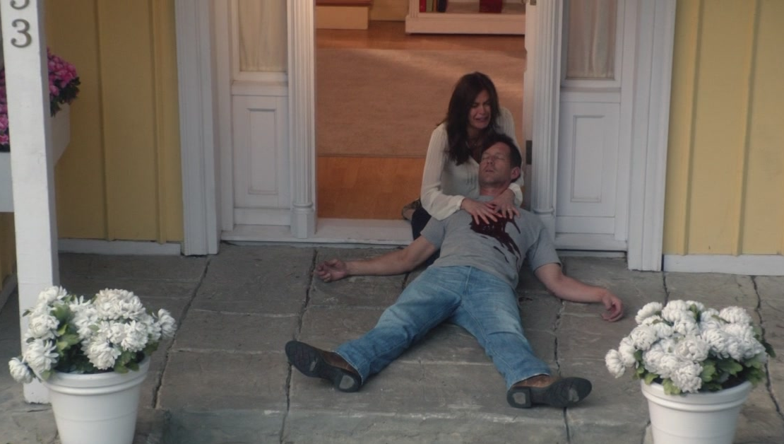 Susan puts her hands over Mike, his eyes shut. The horror is reflected in her voice as she tries to call her husband to his sense, to no avail. She positions his head on her lap, as the tears start pouring down her face, and she tries to stop the bleeding. Susan is overcome with panic and grief at the sight of her deceased husband, the love of her life, and the camera pans away from her as she screams out in horror...