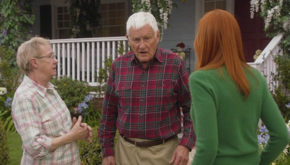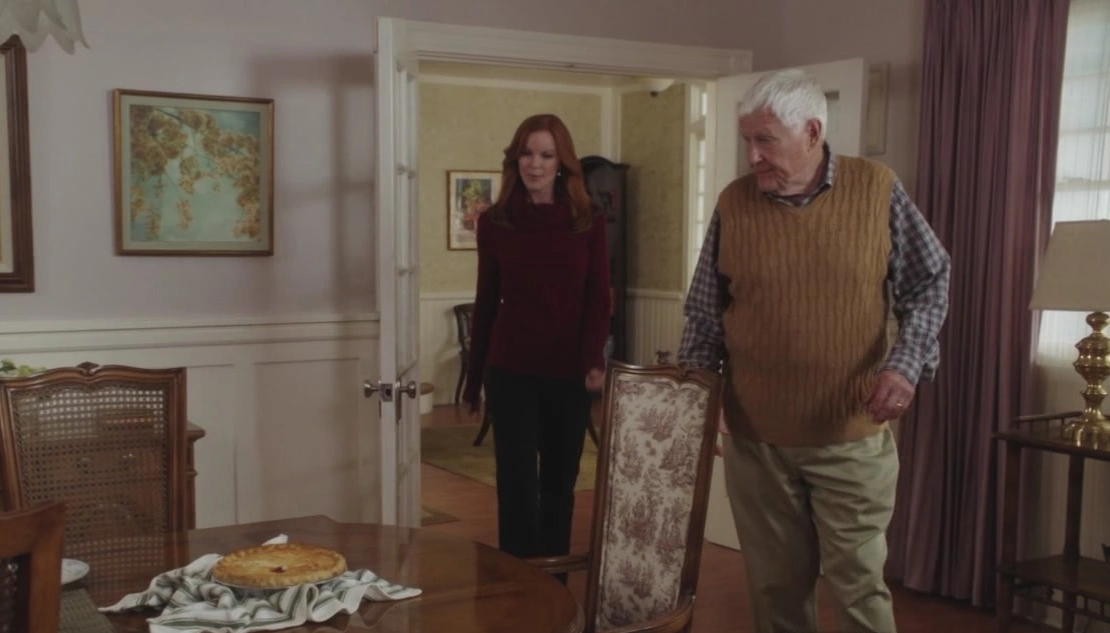After the reunion with the girls, Bree's heading back home when she notices her neighbor Roy Bender kicking some trash cans with discontentment. She rushes to him and his wife, Mrs. McCluskey, and asks if everything is alright. "Doctors! They should learn how to talk to people!", Roy says, clearly angry. Bree tells them she's not following, and Karen explains that they just got back from her appointment, and it appears as though the cancer's spreading faster than anyone thought. Bree is sympathetic. Karen reveals the doctor gave her the old "put your affairs in order" speech, to which Roy adds that it wasn't in a nice manner. He complains that these are people those doctors are talking to, not just some names on a chart. Karen tries quietly to calm him down, but he adds that "They can all go to hell!" before he furiously rushes into the house. Bree tells Karen she's so sorry, and the elderly woman explains that her husband is just pissed at the world. She then plans to crouch down to put the lids back on the trash cans, but Bree does it herself. She then asks how Karen is doing, saying that she can't even imagine what she's going through. After a short moment of silence, Karen tells her neighbor that she's really gonna miss the Christmas festival. Bree takes Karen's hand in hers, and tells her, "Karen, if there's anything I can do for you... I mean it. Anything." Karen thanks her, before heading back into the house. Bree is saddened.