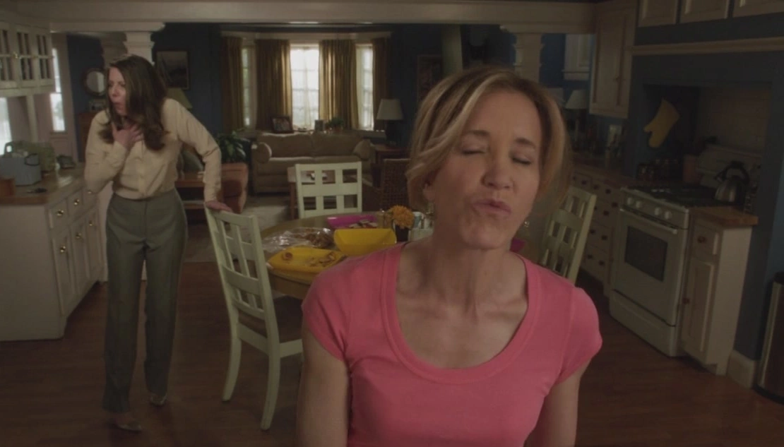 This said, Jane seemingly starts choking on the cheese puff. However, Lynette doesn't notice it, with her back turned to Jane, as she continues talking about how she thinks Jane is sneaky. She believes that Jane did it on purpose, that she couldn't wait to see the look on her face when she told her she and Tom were moving in together. As Jane struggles to breathe, behind her rival's back, Lynette adds that she thinks Jane actually liked it. Jane then bangs on the table with her hand, calling her attention, and Lynette turns to her. Jane tries to get it through to her that she's choking, and Lynette leans back against the sink, watching her. Jane appears to be panicked as she grows weaker, and Lynette appears to not be able to move, as though she's reluctant to help her opponent. Jane is horrified, and then Lynette finally makes a move and performs the Heimlich maneuver on her. After one mere thrust, Jane spits out the cheese puff, recovers her strength and immediately bursts out at Lynette over her reluctance to help. Lynette explains that she panicked, and that she isn't a doctor like Jane is. A disheveled Jane leaves the house, clearly agonized.
