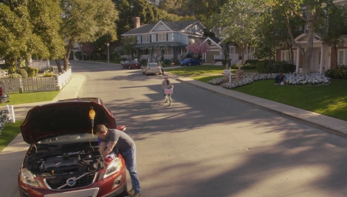 Juanita and Rufus ride by Mike Delfino, who is fixing up his wife's car. They don't seem to pay much attention to each other. Then, Mike waves at someone across the street.